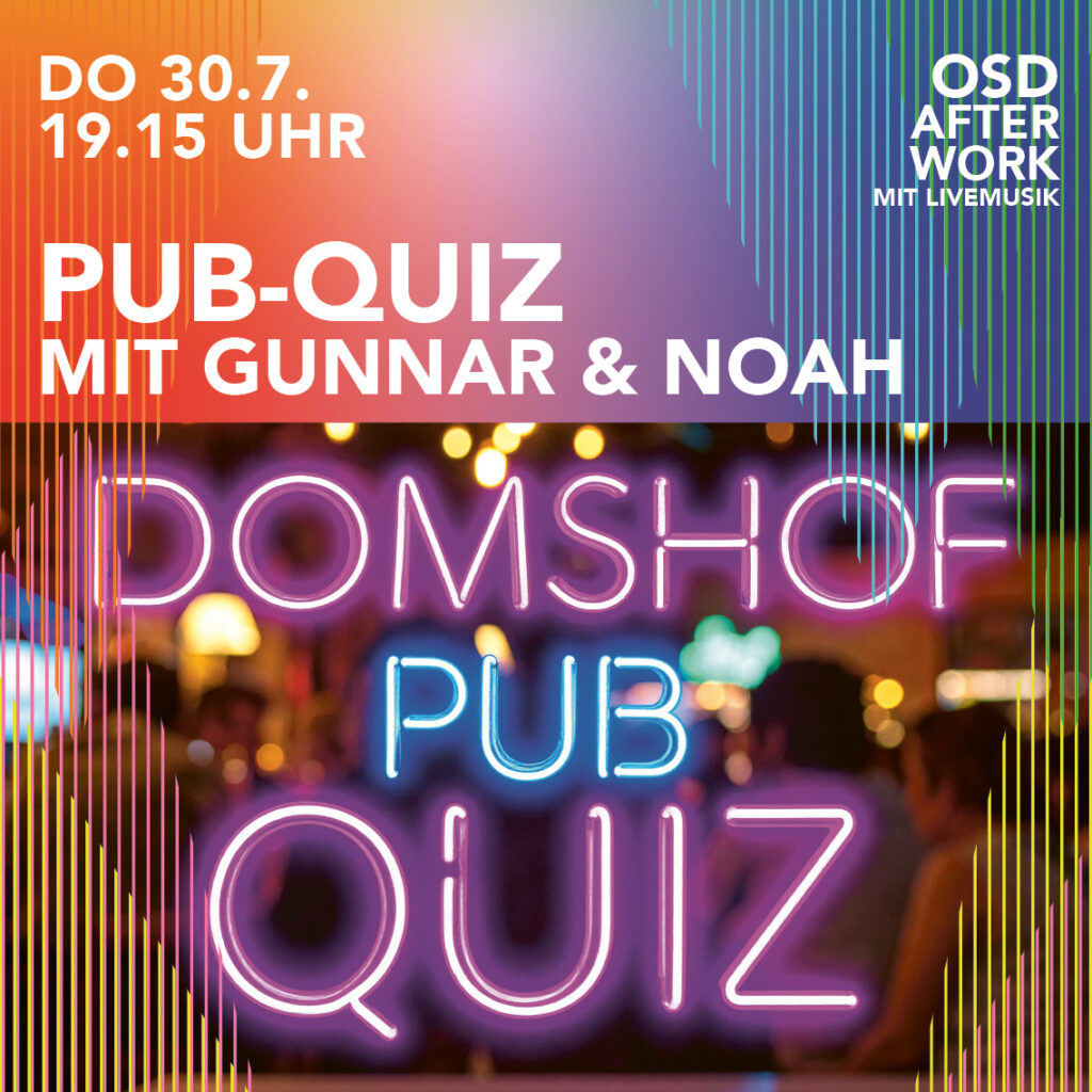 Kluge Köpfe, kalte Getränke und jede Menge Aha-Momente – das ist das Domshof Pub-Quiz. In mehreren unterhaltsamen Runden tretet ihr im Team gegen andere Rätselfans an. Die Themen der Quiz-Master Pakee und Gunnar & Noah sind bunt gemischt, der Spaß garantiert – und wer gewinnt, geht nicht nur mit Ruhm, sondern auch mit einer Flasche nach Hause.